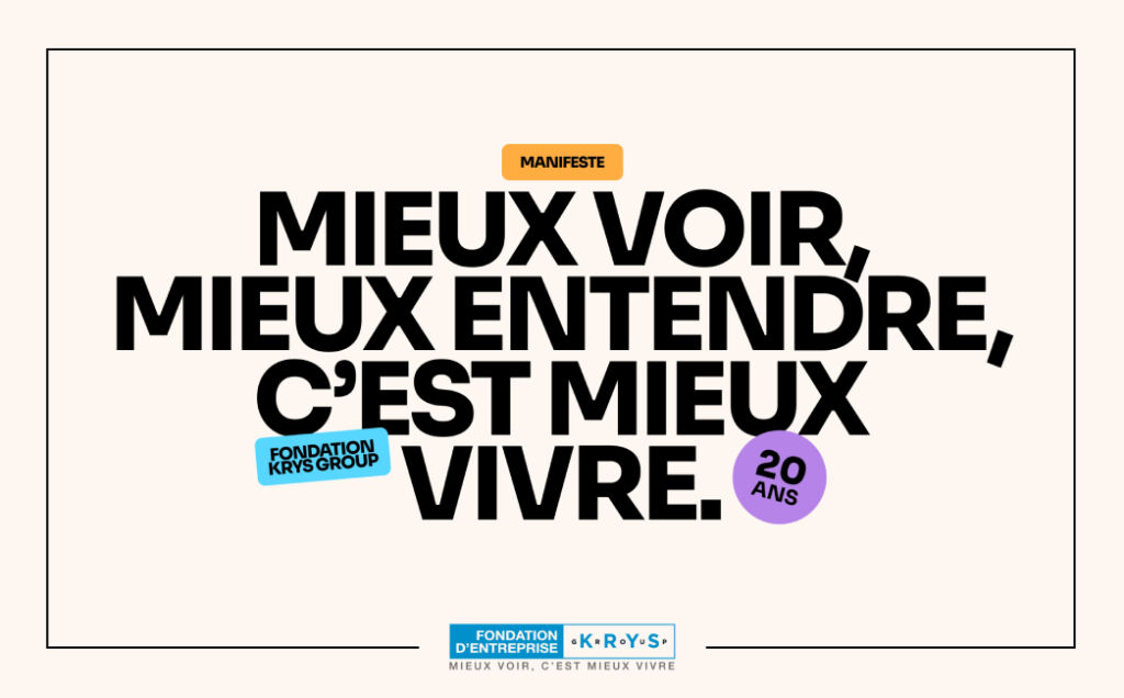 À l’avenir, la Fondation entend bien mobiliser encore davantage les Associés et les collaborateurs de KRYS GROUP autour des enjeux de la santé visuelle et auditive. C’est l’appel qu’elle lance pour ses 20 ans et qui a été repris dans de nombreux supports créés pour marquer l’événement – manifeste, documentaire, podcasts, reverse thinking. De quoi lui donner le plus large écho possible !
